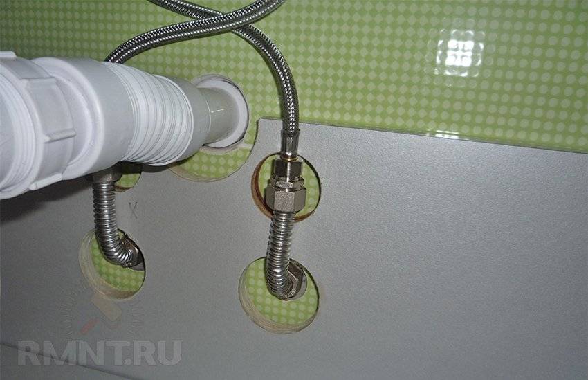 - Монтируют смеситель. Прибор вводят в специальное отверстие до установки раковины. Шланги крепят к корпусу, на шпильки накручивают гайки. После этого чаши трубки подсоединяют к водопроводу.