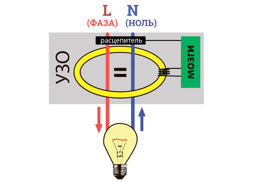 Принцип по которому работает УЗО, это сравнение входящего и выходящего токов. Как известно, ток бежит по двум проводам (3 фазы здесь не рассматриваются) — по фазе и нулю. Если ток потечёт куда-нибудь в сторону, кроме этих двух проводов — УЗО обязано сработать. То есть при возникновении тока утечки определенного номинала, УЗО моментально расцепит контур.