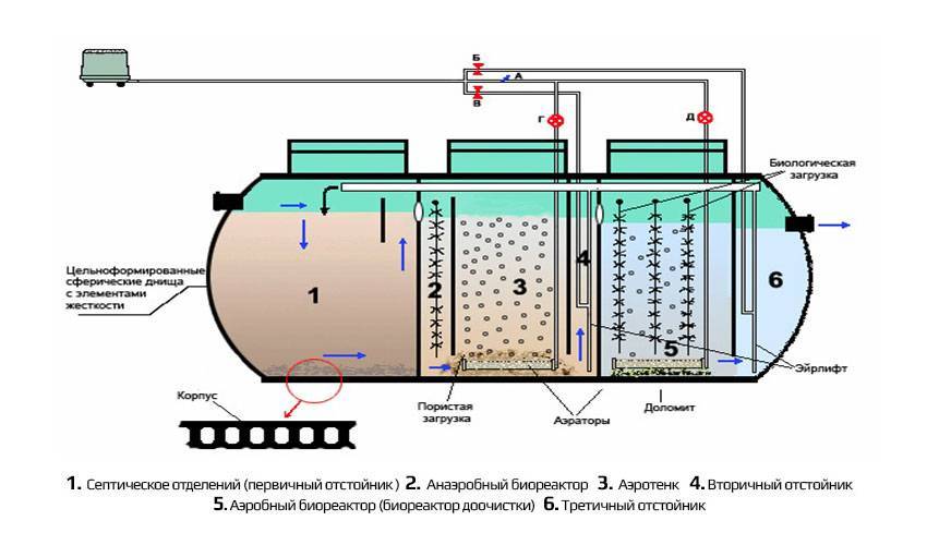 В первом секторе аэробные микробы разлагают стоки до легких компонентов. В следующем отсеке избавляют воду от мелких частиц. В отстойнике нечистоты преобразовывают в ил. Последняя камера накапливает чистую жидкость. Если бак наполнен, то техника предупреждает владельца сигналом.