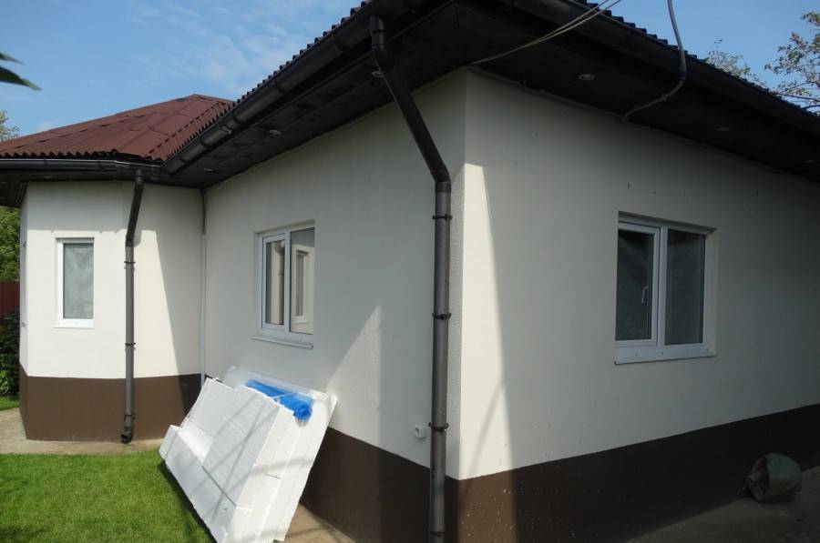 Поверхность утеплителя, оказавшаяся снаружи, покрывается слоем штукатурки – это необходимо для защиты пеноплекса от влаги и физического воздействия.