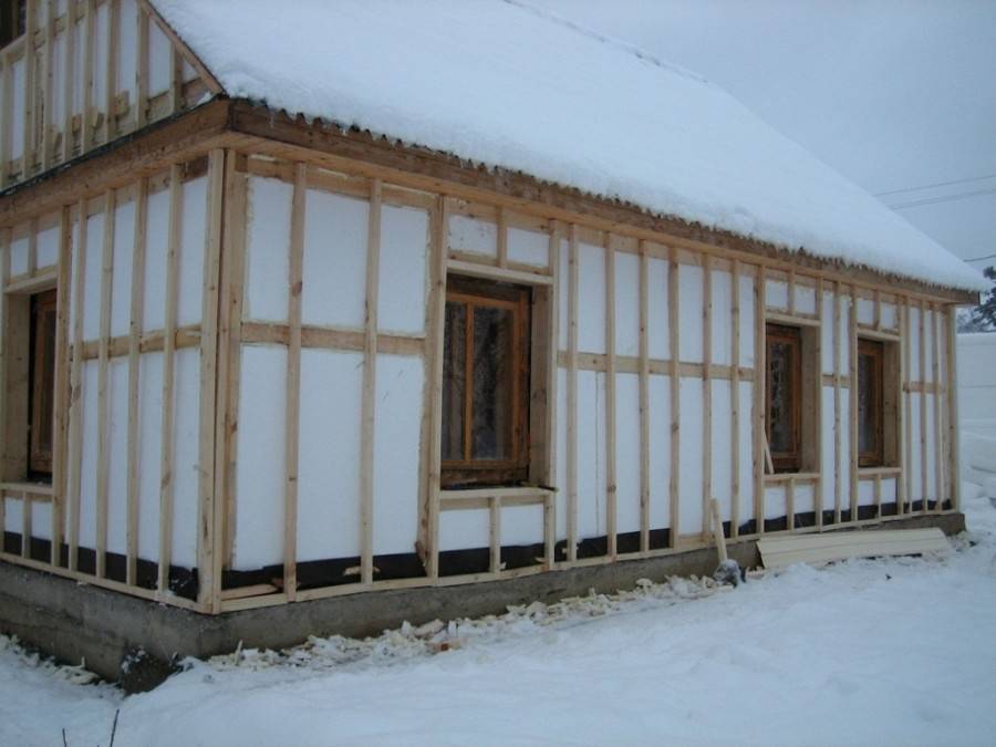 Каркасный метод. Здесь необходимо устройство каркаса. Такой способ укладки пенопласта используется нечасто. Обычно, его выбирают, если хотят в последующем покрыть стены сайдингом или вагонкой.