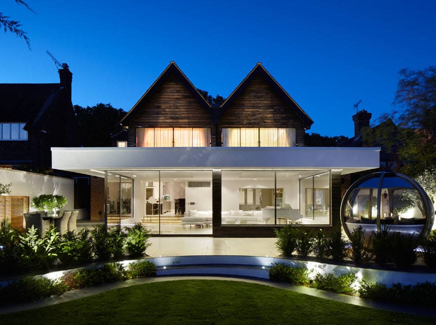 - Основной элемент на всем участке — главный дом. Его выделяют самым ярким светом.
