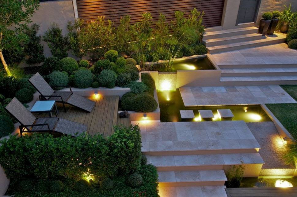 - Следует соблюдать баланс между уровнем освещенности разных объектов. Не должно возникать чрезмерных контрастов в освещении разных территорий. Наиболее освещенными должны быть такие объекты, как садовые беседки, патио. Акцентную подсветку используют для освещения зеленых насаждений на участке.