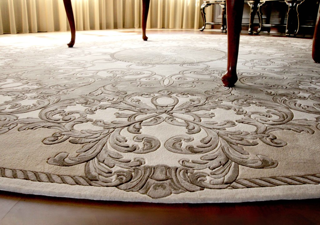 - Скролл. Плотно расположенные к друг другу нити создают плотную поверхность. Они выстригаются на разную высоту, за счет чего формируется рельефный рисунок. Такие ковры называют еще скульптурными или структурными. Смотрятся шикарно, но есть сложности с уходом. Если гостиная/зал у вас «парадные» — этот вариант для вас. Если нагрузка на ковер будет выше средней, он быстро потеряет привлекательность.