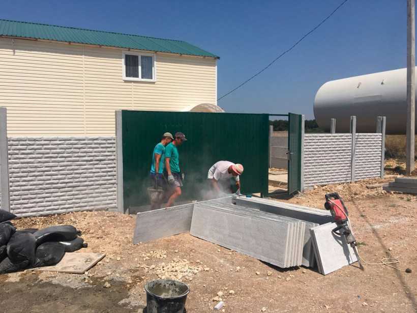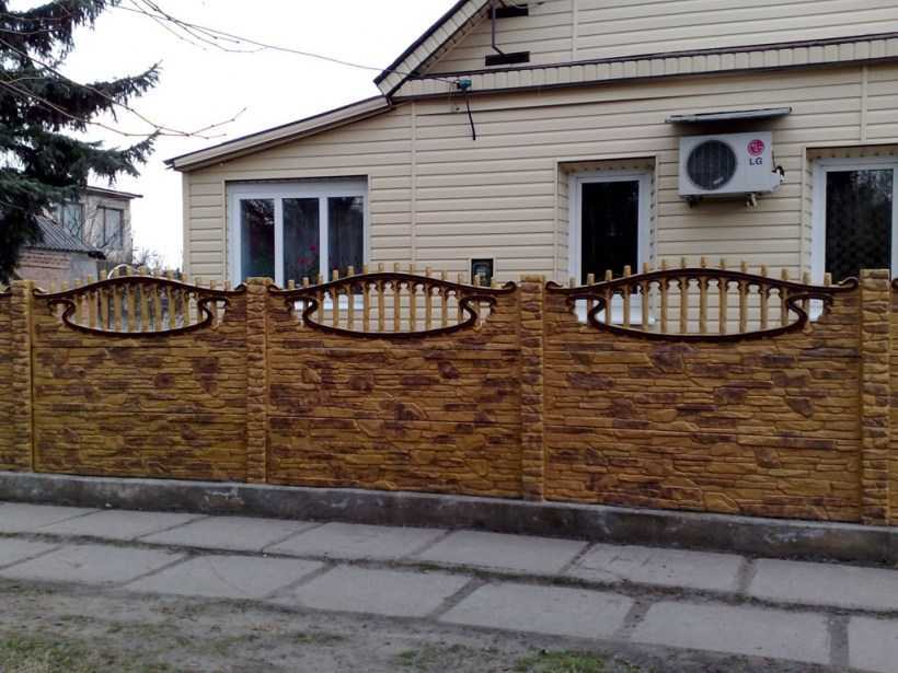 Прочный и легкий в использовании вариант. На сегодняшний день можно выбрать любую палитру и фактуру. Это позволит уйти от скучного серого цвета бетона. У бетонного забора много преимуществ: