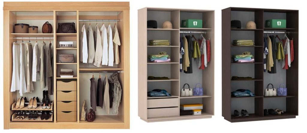 Внутри шкафа обычно три зоны, верхняя, средняя и нижняя. На самой нижней части крепят полки для обуви, стеллажи и обувницу. В средней части располагаются штанги, открытие полки, выдвижные ящики. Наверху устанавливается штанга для длинной одежды, открытые полки для наименее часто используемых предметов.
