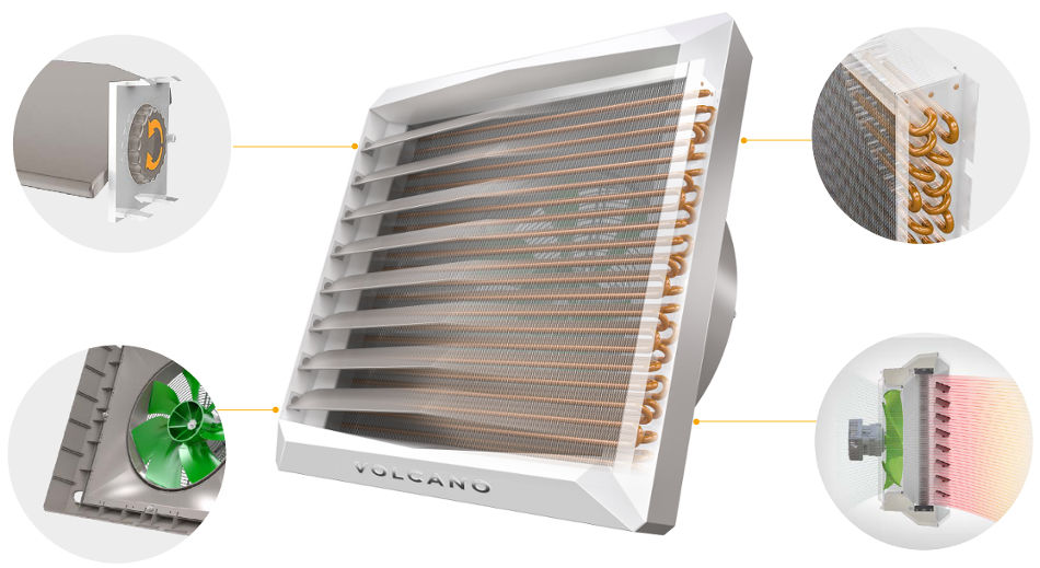 - Тепловые вентиляторы Volcano mini отличаются компактными размерами и практичностью. Их выпускает одноименная польская компания. Для смены направления потока воздуха есть специальные жалюзи. Мощность – 3-20 кВт, производительность составляет 2 тысячи кубометров в час. Агрегат имеет двухрядный теплообменник с классом защиты ІР 44. Предельное рабочее давление – не более 1,6 МПа, а максимальная температура теплового носителя +120 градусов. Объем теплообменника составляет 1,12 л. Подходит для подогрева воздуха в производственных и бытовых помещениях.