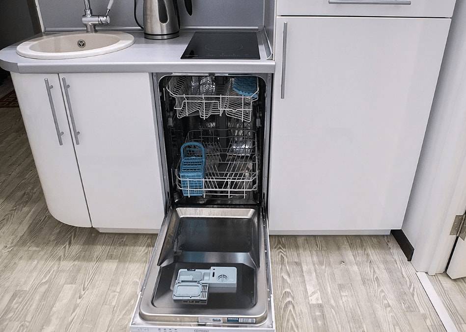 Встраиваемые машинки имеют всего два размера — это 60 и 45 см. Для маленьких кухонь лучше всего выбирать размер 45. Однако, тщательно продумайте, куда именно вы захотите поместить технику. Ведь от этого зависит подключение к воде и размещение розеток.