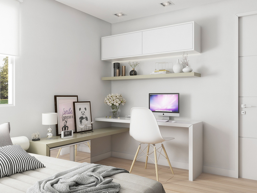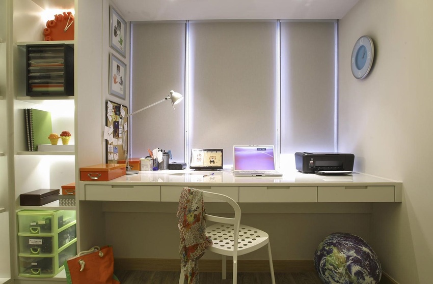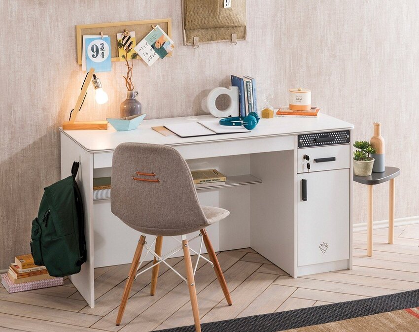 Важно грамотно организовать системы хранения: карандаши сложить в специальные стаканы, книги расставить на дополнительных полках, сложить тетради в ниши и выдвижные ящики. Также хорошо использовать магнитные, пробковые, грифельные доски, на которых удобно оставлять важные пометки и крепить записки