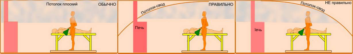 Нужно расчитывать, высоту потолка в парной с пироговым микроклиматом так, чтобы голова посетителя или парильщика не доставала до потолка на 85, минимум на 65 см, иначе нахождение в горячей зоне плохо влияет на самочувствие. От пола до потолка 235-265 см, оптимально для людей среднего роста или соизмеримо высоте работающего парильщика. Голова банщика не должна располагаться близко к облаку пара.
