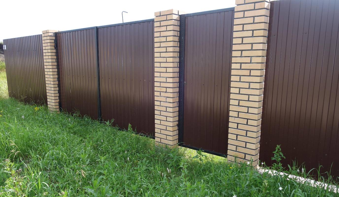 Красивый вариант сочетания кирпичных столбов и профнастила с покрытием, имитирующим кирпичную кладку.
