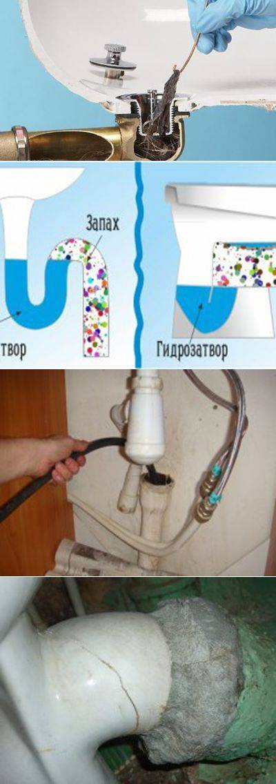 Засор слива. При ежедневном пользовании умывальником, стиральной машиной и ванной, в трубы вместе с водой попадает много сопутствующих веществ: жиры, волокна, волосы, клочки мусора и пыли с одежды. Все эти компоненты оседают на стенках труб и накапливаются там со временем. В условиях постоянной влажности все перечисленные вещества начинают разлагаться, это способствует развитию бактерий, а как результат, невыносимый запах.