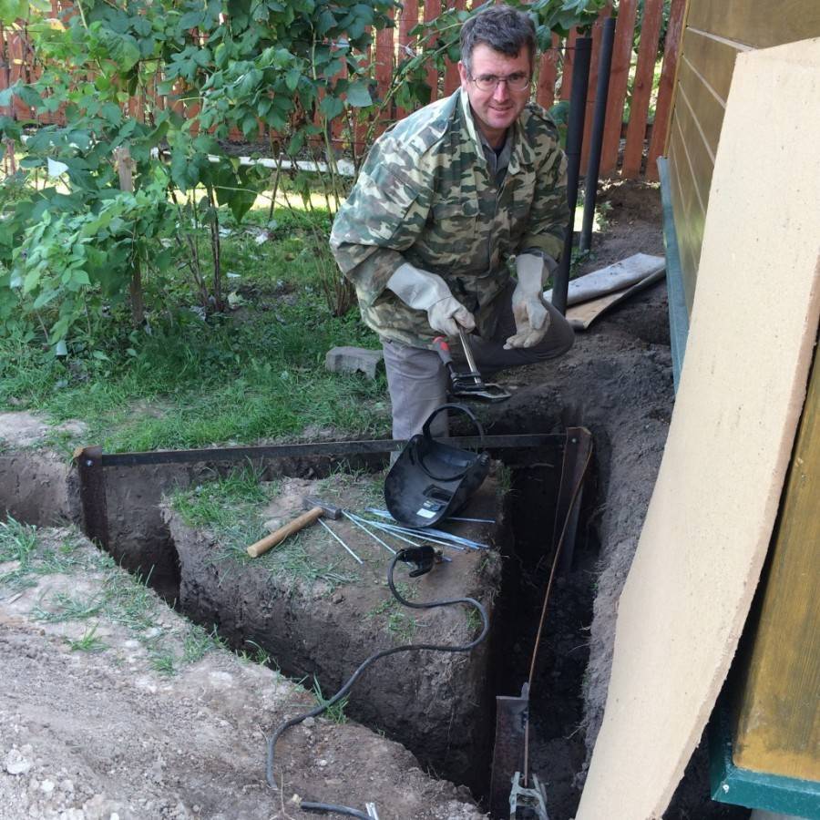 После того как было выбрано место, выполнена разметка (под треугольник со сторонами 3 м), определено место вывода полосы с болтами на фундамент здания можно приступать к земляным работам.