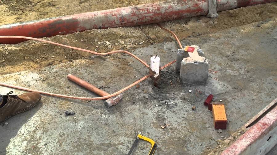 В готовую траншею закладывают заземляющую конструкцию. Для этого концы штырей предварительно затачивают болгаркой, затем забивают их в грунт на глубину 3 м по концам треугольника. Их верхние окончания должны располагаться на плоскости ямы.