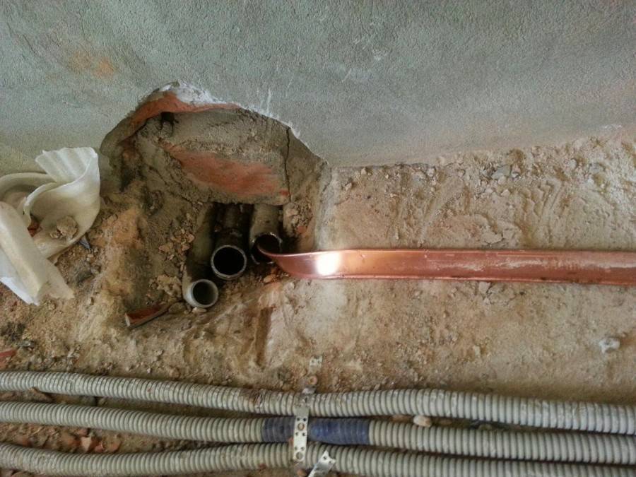 Как вариант, в цоколе здания можно просверлить отверстие, в которое вставляется металлический штырь или шпилька, приваренный к полосе заземляющего контура. В этом случае медный проводник подсоединяется с внутренней стороны здания.