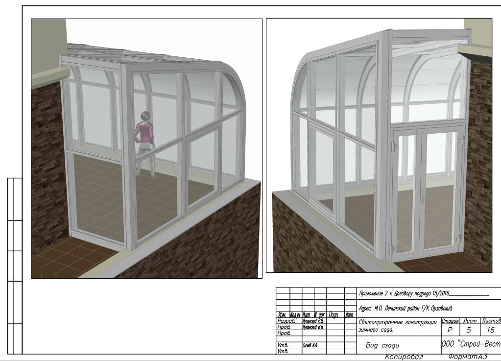 При создании застеклённых пристроек различной сложности и любого назначения требуется огромные вложения времени и труда большого коллектива специалистов: дизайнеров, инженеров-конструкторов, рабочих строительных специальностей. Вначале архитекторы и дизайнеры создают проект будущего строения, после чего готовится пакет технической документации, и уже после этого происходит непосредственно изготовление сооружения. Необходимо помнить, что чем выше сложность проекта, тем сложнее его реализовать.